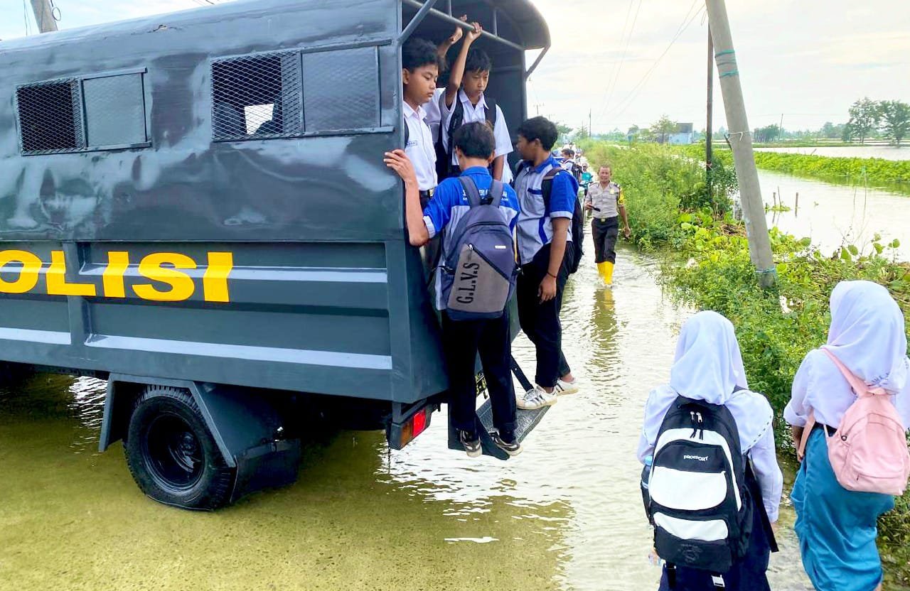 Tak sekedar menjaga wilayah rawan banjir, aparat kepolisian juga menunjukkan aksi nyata dengan membantu aktivitas warga, terutama para pelajar yang tetap harus berangkat ke sekolah meski akses jalan tergenang air.