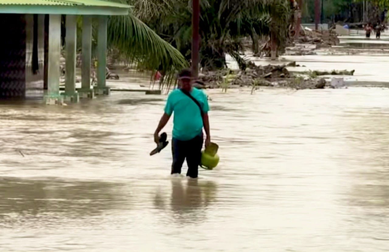 Dalam rekaman tersebut, tampak warga harus berjalan menembus air setinggi lutut dengan arus yang tak pernah berhenti.