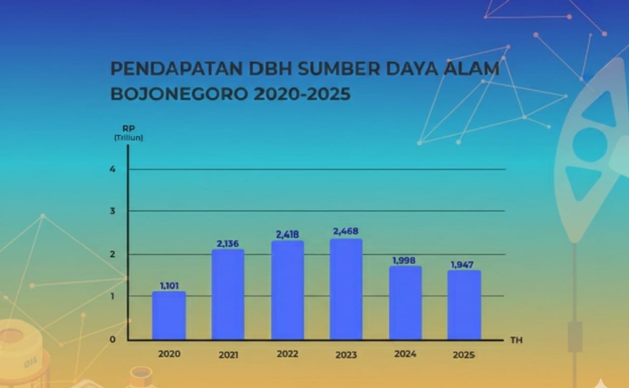 Berdasarkan data Badan Pendapatan Daerah (Bapenda) Kabupaten Bojonegoro, realisasi DBH SDA dalam lima tahun terakhir tercatat sebagai berikut, 2020 Rp 1,101 triliun, 2021 Rp 2,136 triliun, 2022 Rp 2,418 triliun, 2023 Rp 2,468 triliun, 2024 Rp 1,998 triliun, 2025 Rp 1,947 triliun.