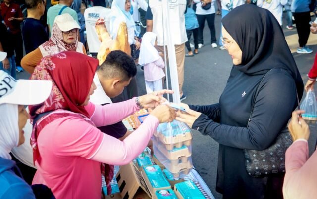 Bersama para ibu penggerak, ia turun langsung ke tengah kerumunan untuk mengenalkan telur Gayatri produk unggulan lokal yang kini mulai mencuri perhatian warga Bojonegoro.