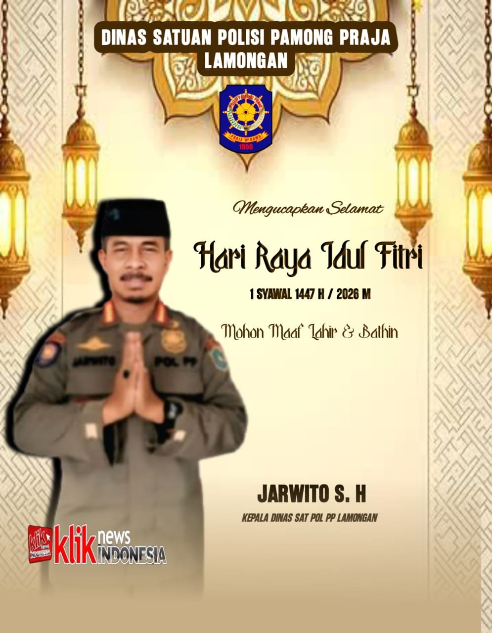 Dari Kepala Dinas Satpol-PP Lamongan, Jarwito S.H, saat di konfirmasi awak media KLIKINDONESIA, Pada Senin (02/03/2026) Mengatakan, “Saya Selaku Kepala Dinas dan semua anggota Satpol-PP Lamongan – Jawa Timur, mengucapkan selamat menunaikan ibadah puasa dan menyambut hari raya Idul Fitri 1447 H / tahun 2026, kita sekarang menjalani ibadah puasa sudah melangkah hari ke-12, mari kita tingkatkan iman kita, dan semoga semua amal ibadah kita di terima oleh Allah S.W.T. ,” Pungkas Kepala Satpol-PP Lamongan Jarwito S.H. (Erna)