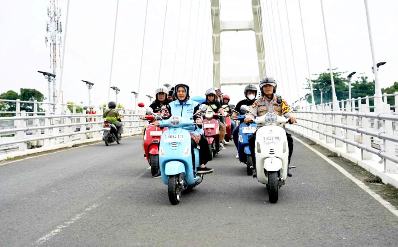 Menariknya, Wakil Bupati Bojonegoro, Nurul Azizah, tampil nyentrik dengan memimpin langsung iring-iringan menggunakan Vespa matic berkelir biru.