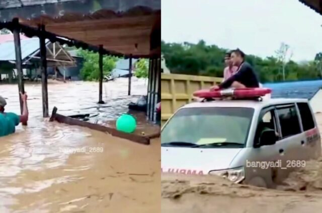Dalam rekaman video lainnya, terlihat situasi dramatis di Desa Ju’uh, saat sejumlah warga terjebak di jalanan yang terendam banjir.