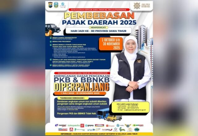 Program ini merupakan kesempatan langka untuk menghapus denda dan menebus tunggakan dengan biaya lebih ringan. Pemprov Jatim pun mengajak seluruh wajib pajak memanfaatkan periode ini sebaik mungkin. (***) *[]