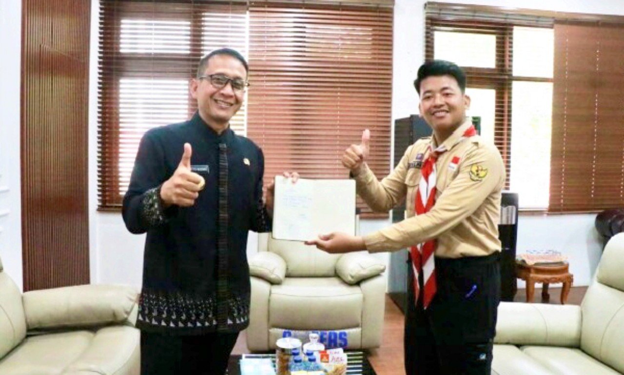 Mengenakan seragam Pramuka lengkap, Alpandy datang ke Kantor Pemerintah Kabupaten Bojonegoro dan disambut langsung oleh Bupati Setyo Wahono bersama Wakil Bupati Nurul Azizah.