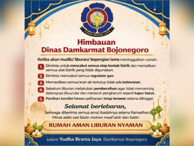 BOJONEGORO – Menjelang arus mudik dan libur Lebaran, Pemerintah Kabupaten Bojonegoro melalui Dinas Pemadam Kebakaran dan Penyelamatan (Damkarmat) mengingatkan masyarakat untuk tidak lengah dalam menjaga keamanan rumah yang ditinggalkan.