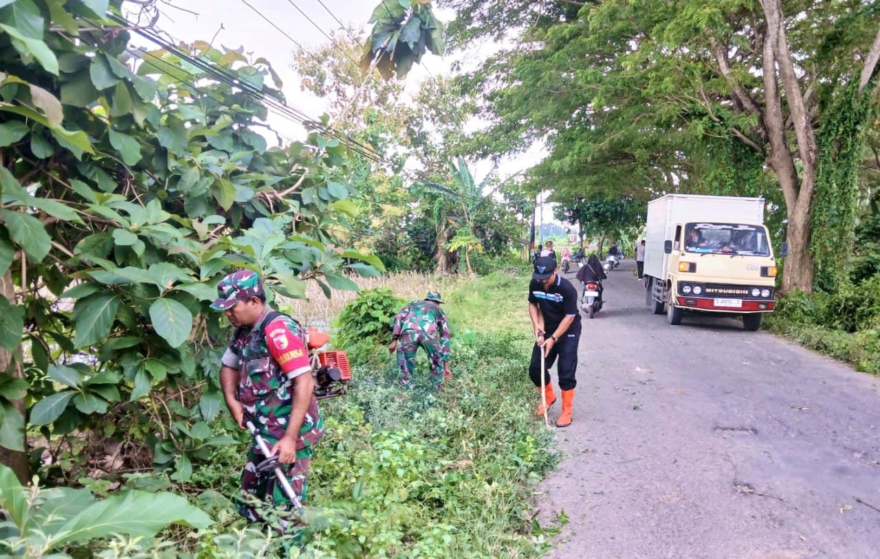 Personel Koramil 0812/19 Laren bersinergi dengan unsur Muspika menggelar karya bakti pembersihan jalan poros Laren–Blimbing, Kabupaten Lamongan, Sabtu (7/2/2026).