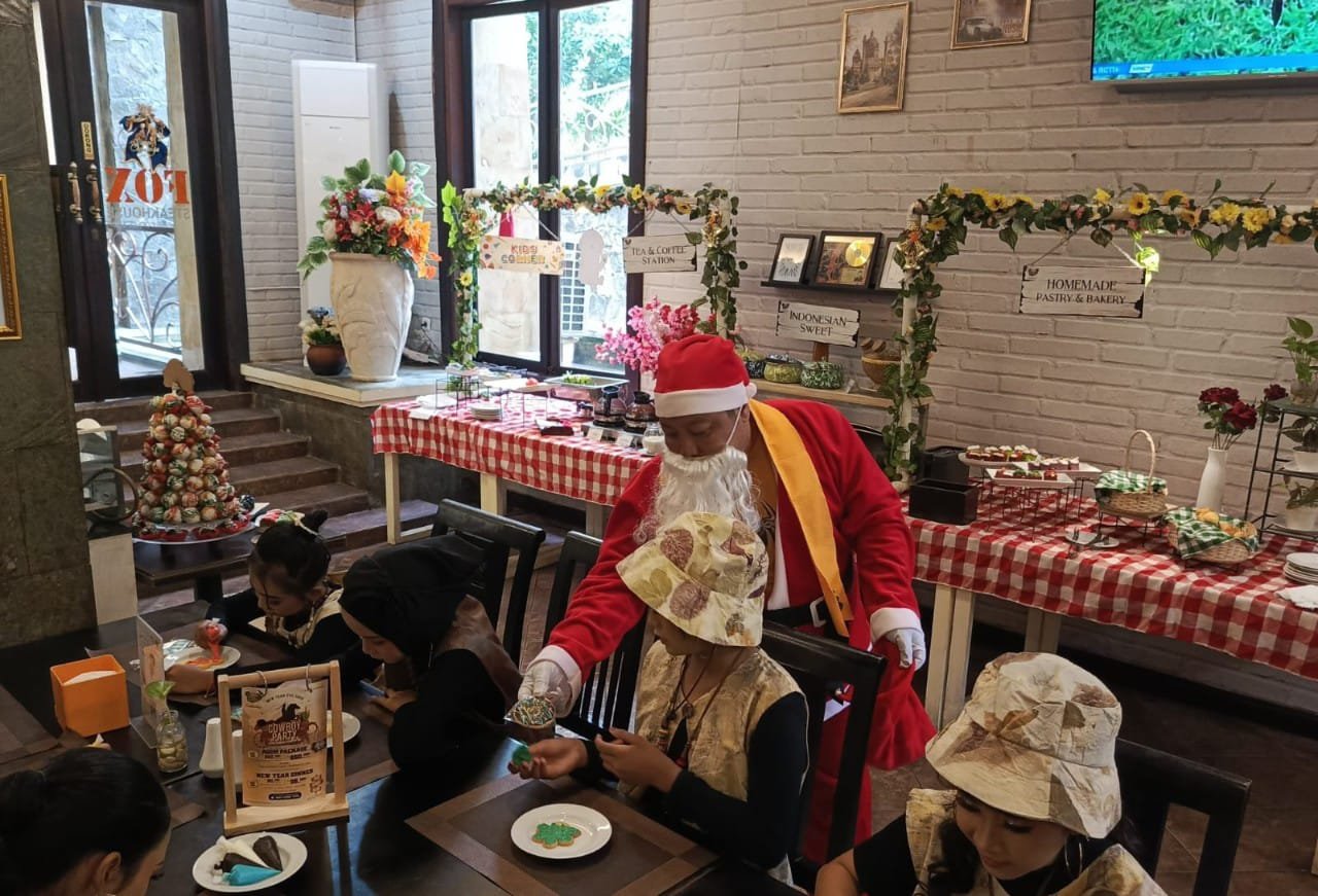 Santa Claus dengan kostum merah khas dan janggut putih tampak berkeliling area hotel sejak pagi hari. Dengan sapaan ceria “Ho Ho Ho”, Santa menyapa para tamu yang tengah menikmati sarapan.