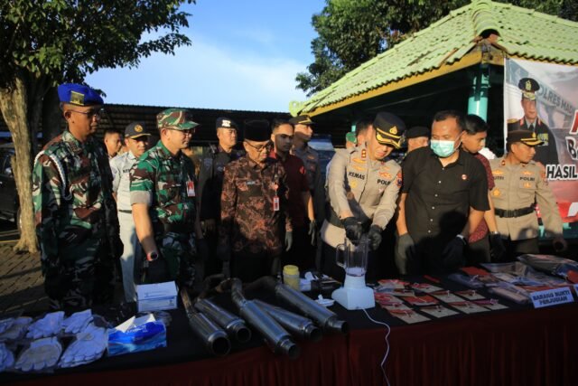 Selain ribuan liter miras dan puluhan gram sabu, petugas juga menyita berbagai barang bukti pendukung lainnya seperti sepeda motor (Honda Beat dan Yamaha N-Max), senjata tajam, serta alat komunikasi.