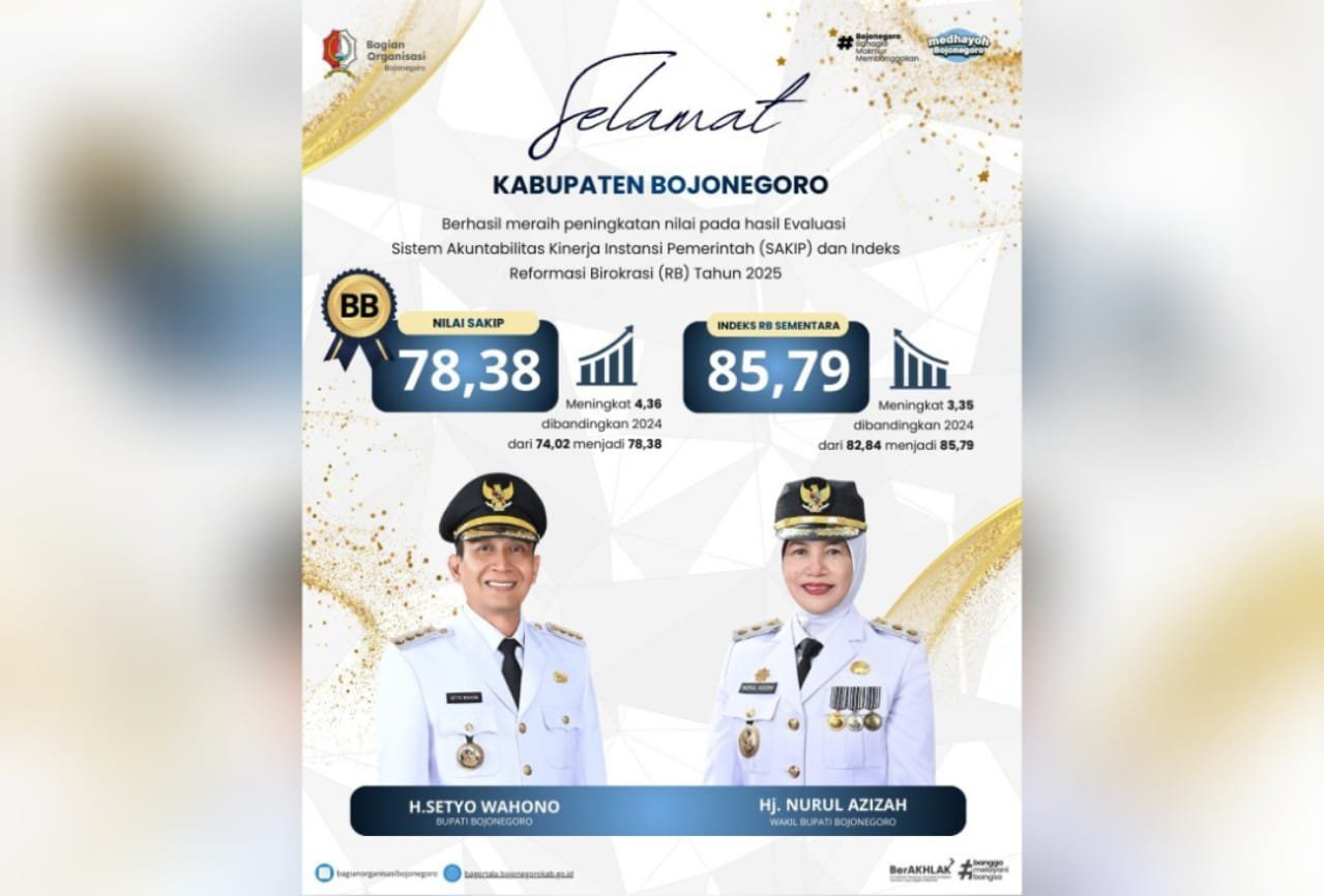 Terbaru, nilai Sistem Akuntabilitas Kinerja Instansi Pemerintah (SAKIP) Kabupaten Bojonegoro melonjak 4,36 poin, dari 74,02 pada 2024 menjadi 78,38 di 2025, dengan predikat BB.
