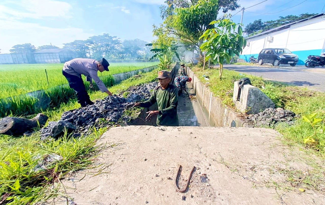 Puluhan personel dari Polsek Kalitidu, Koramil Kalitidu, serta Satpol PP Kecamatan Kalitidu tampak bahu-membahu membersihkan saluran air.
